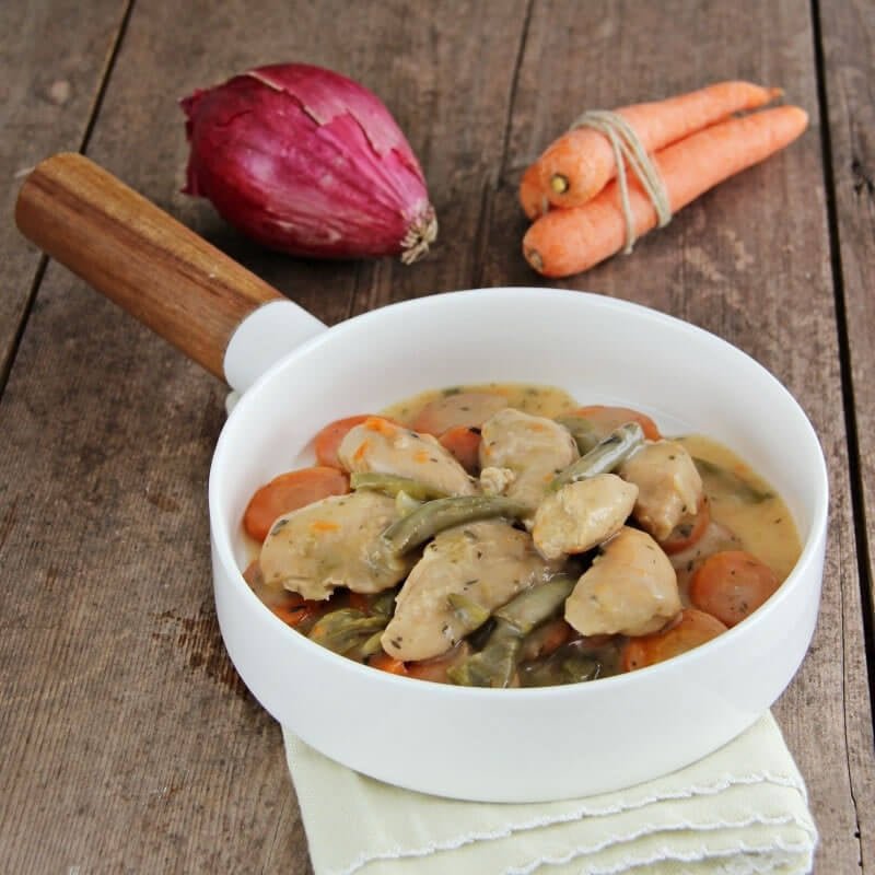 Carne di pollo precotta 35,7 % (carne di pollo, acqua, fecola di manioca, amido di riso, sale), fagiolini 21,9 %, acqua, carota 11,7 %, panna fresca (latte) 3,2 %, inulina 2,8 %, cipolla, proteine di piselli, fibra vegetale, dragoncello, aglio, scalogno, sale, pepe bianco, timo.